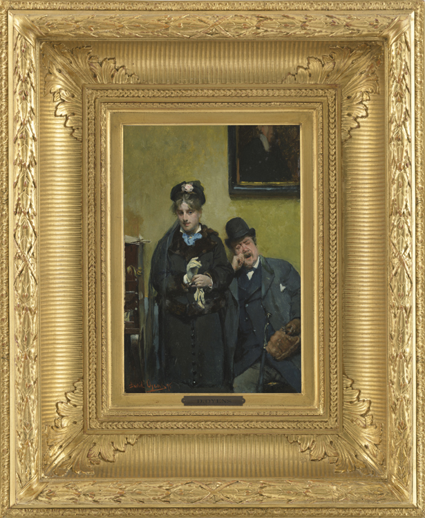 Zowel het hier afgebeelde werk Avant le promenade als Le départ pour le Salon zijn afkomstig van de hand van David Oyens. Ze werden geschilderd in het jaar 1875 en behoren daarmee tot werken uit zijn beste periode (1875-1880). Op Avant le promenade zien we een echtpaar dat zich klaarmaakt voor de wandeling, geheel gekleed naar de mode van die tijd. De man zit al klaar met zijn wandelstok en mof (een bontje om de handen in warm te houden). David schilderde hier zichzelf en zijn echtgenote Betsy, waarvoor hij zijn tweelingbroer Pieter en een andere vrouw model liet staan. Omgekeerd stond David overigens ook vaak model voor Pieter. Het echtpaar David en Betsy Oyens maakte op zondag graag een wandeling naar het Bois de La Cambe, waar zij vervolgens een rondje om de vijver liepen. Vaak werd daarna het huis van de bevriende schilder Theo Kruseman aangedaan. Het schilderij is geschilderd in het atelier van de Oyensens. De piano, die ook op andere interieur-scenes terugkomt (de tweeling was dol op piano spelen), is nog net links in beeld te zien. Hoewel David zijn figuren vaak schilderde tegen een donker fond, heeft hij hier gekozen voor een fraaie lichte achtergrond in okertinten. In het werk zit ook een humoristische ondertoon die typerend is voor het oeuvre van de gebroeders Oyens. Terwijl de dame haar handschoenen nog aan het aantrekken is, dommelt haar echtgenoot alweer in slaap. Het wachten duurde hem zeker te lang…